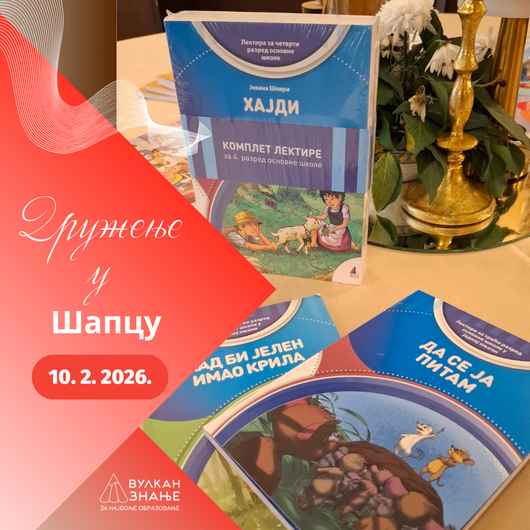 У пријатном амбијенту, уз освежавајуће напитке и послужење, представићемо уџбенике Вулкан знања за 4. и 8. разред за предмете српски језик и књижевност, математика, историја, биологија, географија, енглески језик, физика, хемија, ликовна и музичка култура, информатика и рачунарство и техника и технологија.