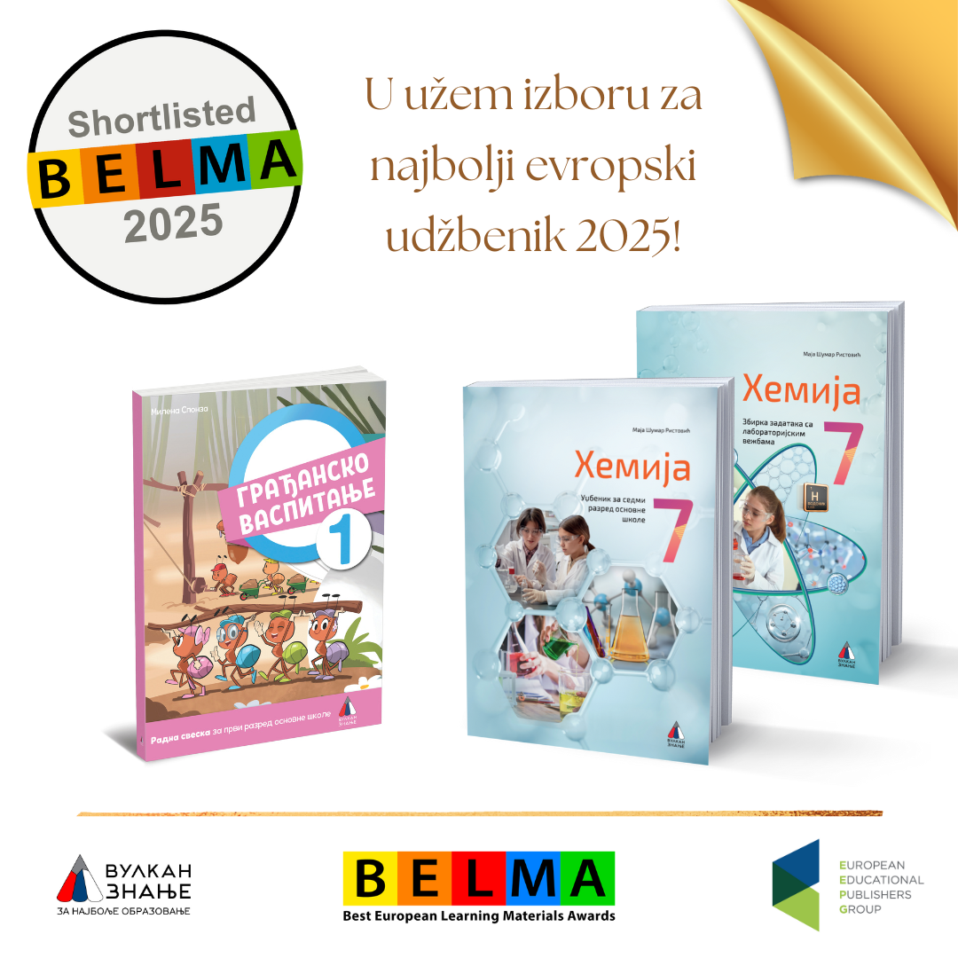 Наши уџбеници „Грађанско васпитање“ за 1. разред и „Хемија“ за 7. разред ушли су у ужи избор за престижну награду Најбољи европски уџбеник 2025 (BELMA)!