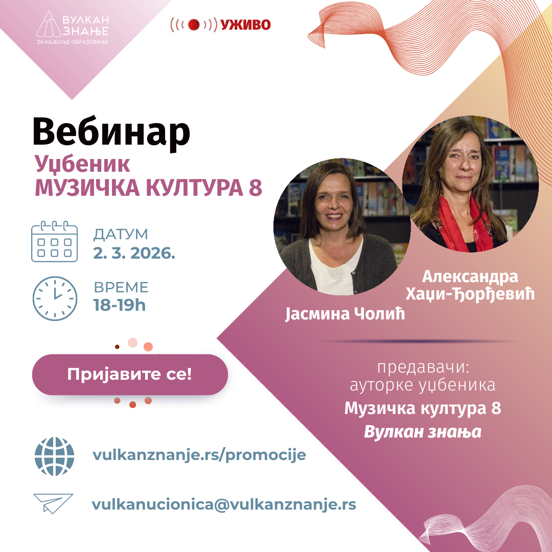 Позивамо вас на вебинар током којег ћемо вам представити уџбеник Музичка култура 8 Вулкан знања.